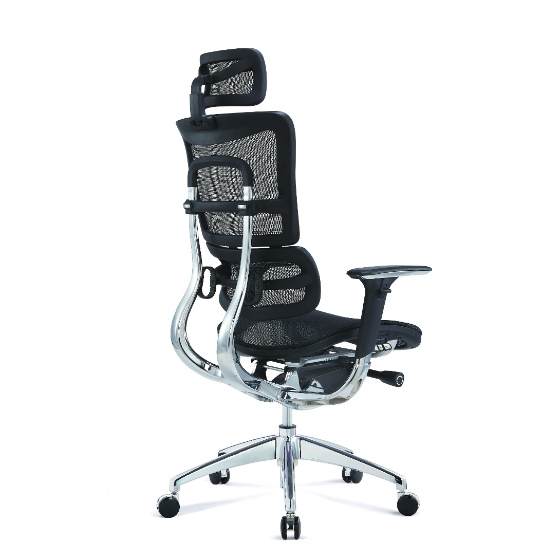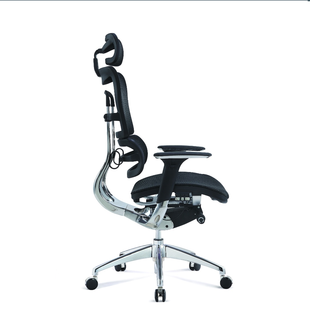Especificación: • Malla importada • Marco negro fabricado con fibra de vidrio. • Diseño de respaldo alto con soporte lumbar flexible • Diseño patentado exclusivo de mecanismo de control de 3 cables, que puede ajustar todo el asiento solo con la punta de los dedos • Elevación de gas SHS Clase 4: 100 mm • Base de aluminio pulido: 700 mm • Capacidad de peso: 300KGS • El diámetro de las ruedas de PU es de 65 mm.
